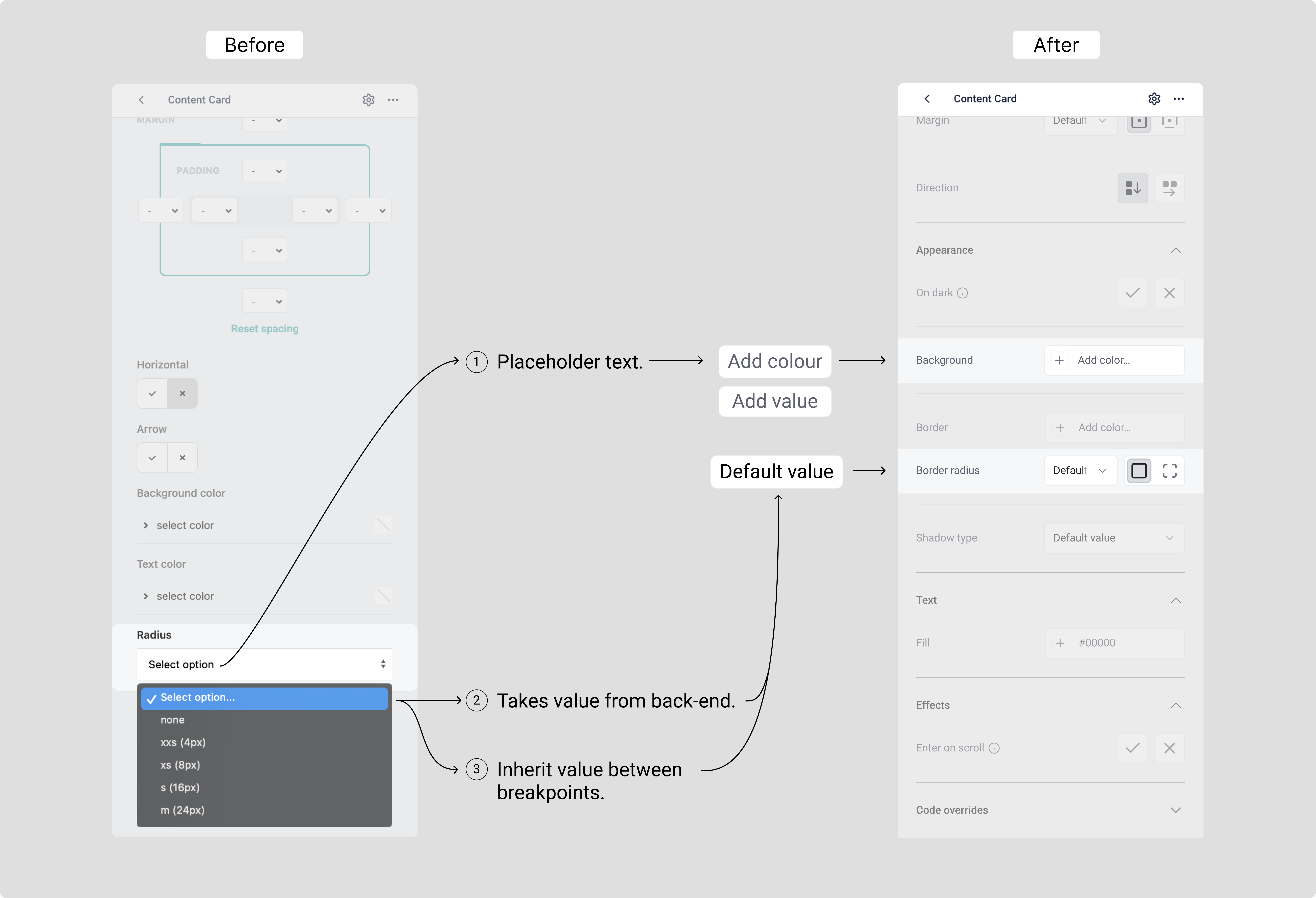 Standardised component handoff and accelerated implementation. The new categorisation of settings in the panel created a component taxonomy, paving the way to eliminating developer manual alignment to schema.